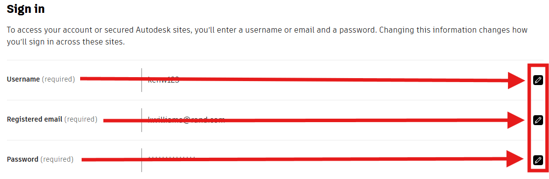 - Under "Sign in" you have the option to edit the Username, Registered email, and Password for the Autodesk site.