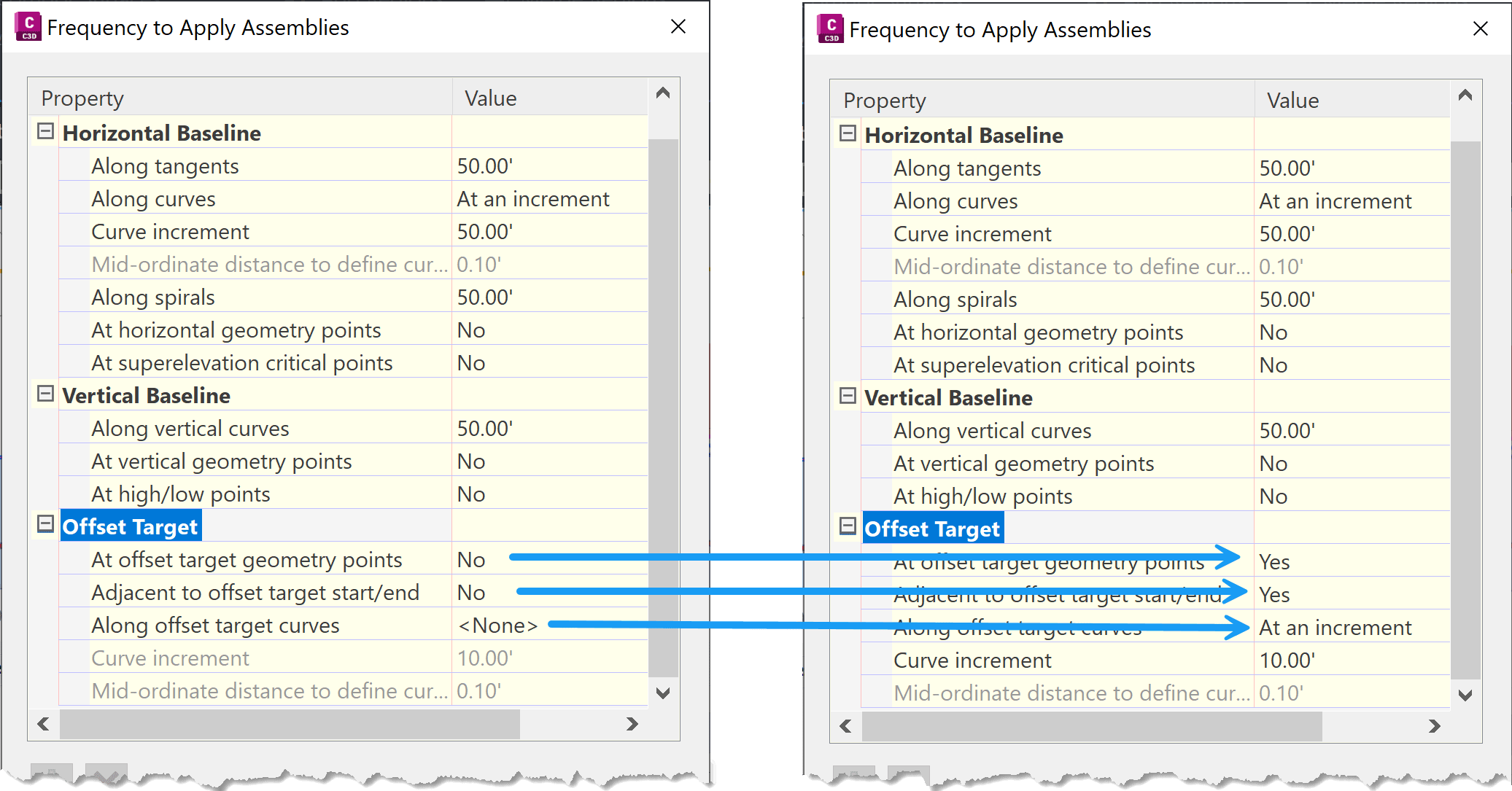 This happens because Civil 3D only evaluates conditional logic at corridor sample stations. With no additional sampling, Civil 3D does its best to interpolate geometry between the 50’ stations, which leads to inconsistent results.