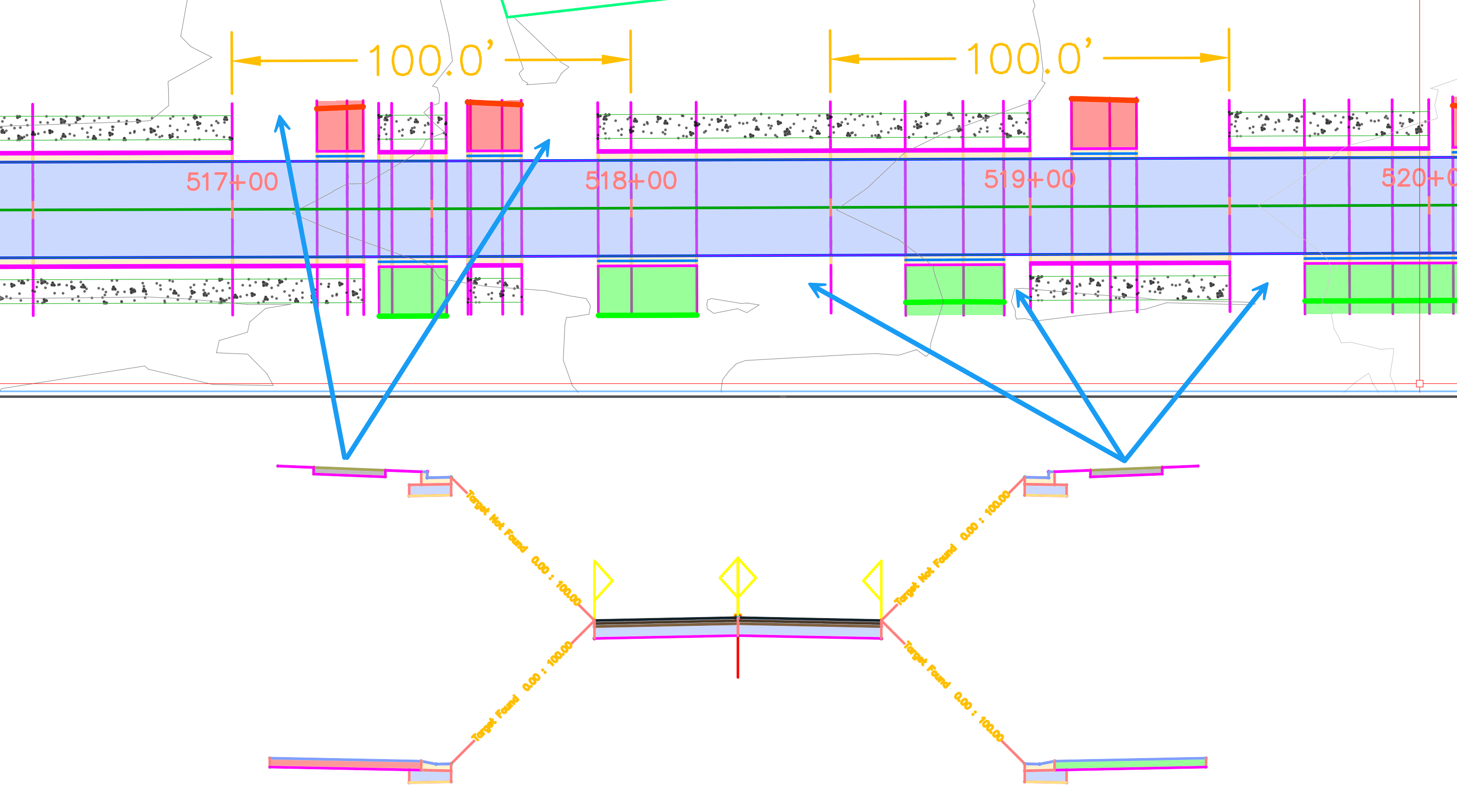 In this third and final post on Conditional Horizontal subassemblies, the focus will be on extending sidewalk areas between driveway sections that were created from the corridor in Part2. Building on the previous post, corridor targets have already been set, additional frequency at targets has been enabled, and left and right sides have been isolated.