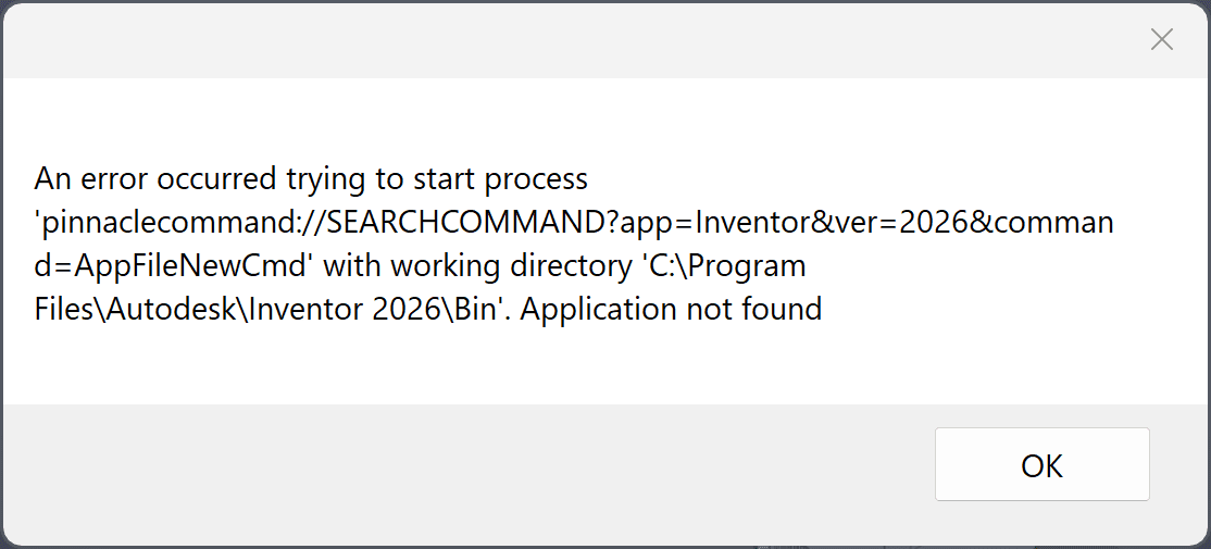 An ‘Application not found’ pop-up error opens on most Inventor commands or when creating a new file: