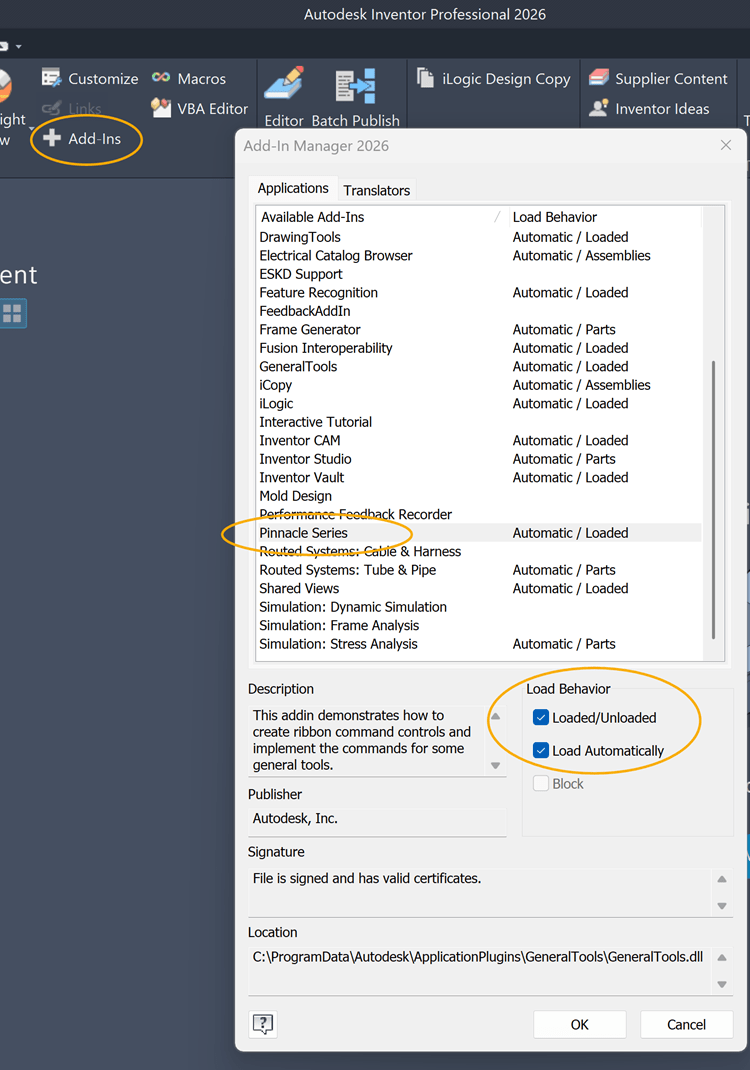 Verify that the Pinnacle Series Add-In is loaded in Inventor:
