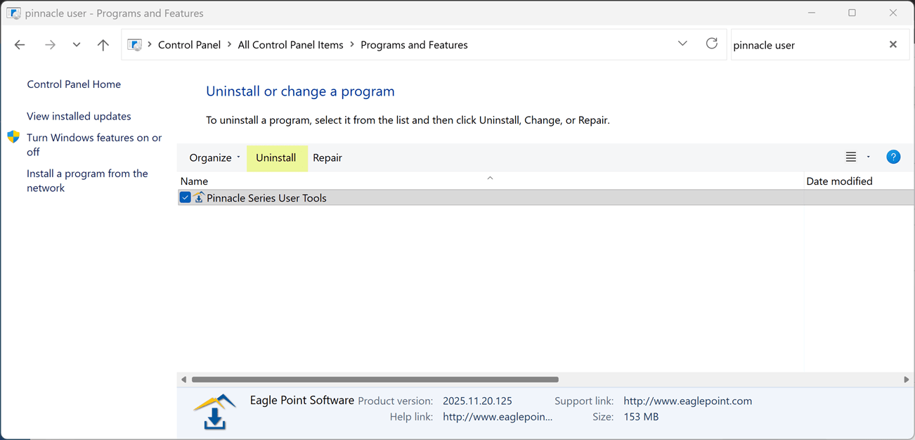 You can also verify if the PinnacleCommandLauncher.exe file exists in C:\Program Files (x86)\Pinnacle Series User Tools\. If the file doesn’t exist or the folder is empty, this is a good indication that the installation is corrupt.