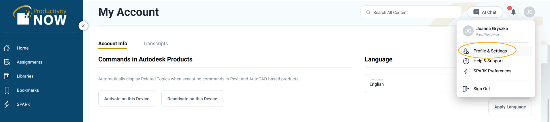 Go to the User Profile icon at the top right in your Productivity Now account.