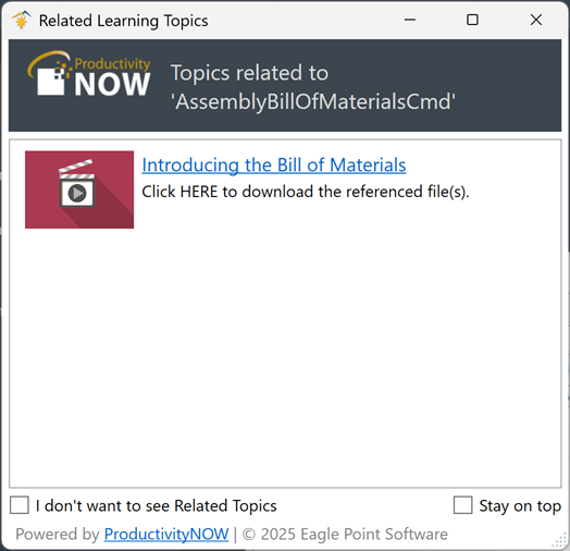 When the Pinnacle User Tools are loaded in Inventor, a Related Learning Topics dialog box opens with related Inventor topics that are available in Productivity Now content.