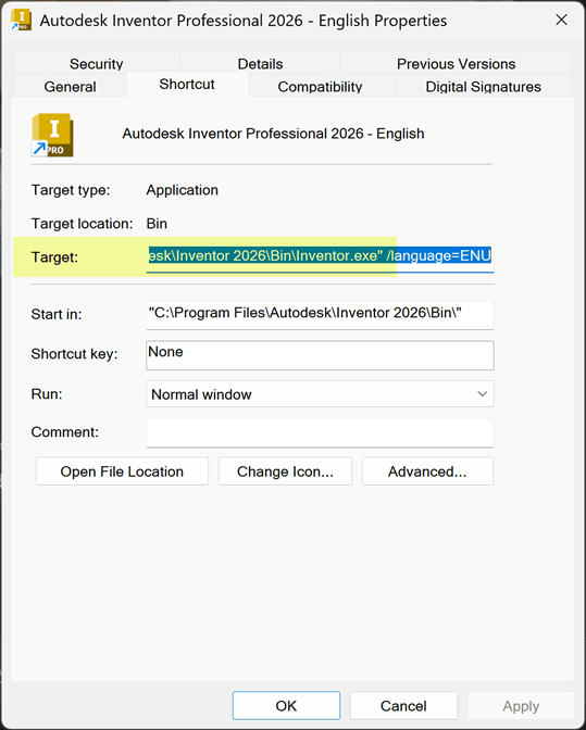 - Inspect the Shortcut tab and the Target path to Inventor.exe: