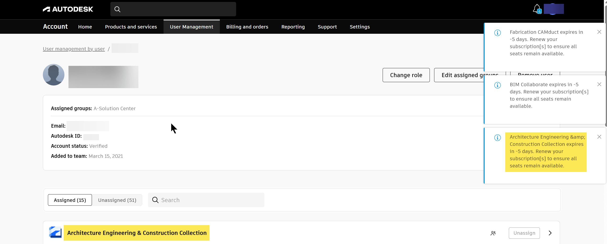Select the user Autodesk account with the faded image and a dialog box will appear to notify one of the licenses is expiring soon. In the below example, a user is assigned an Architecture Engineering & Construction Collection license that is expiring, and their user image is still faded.