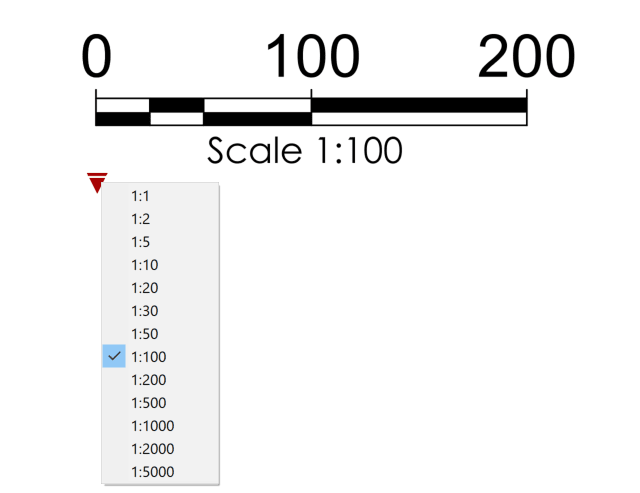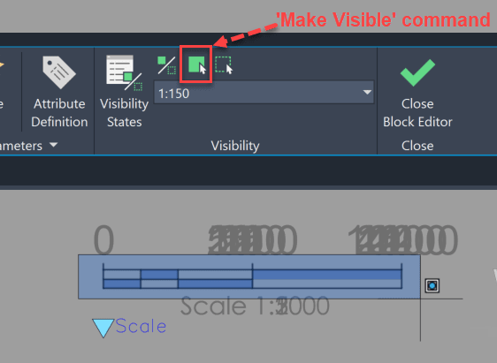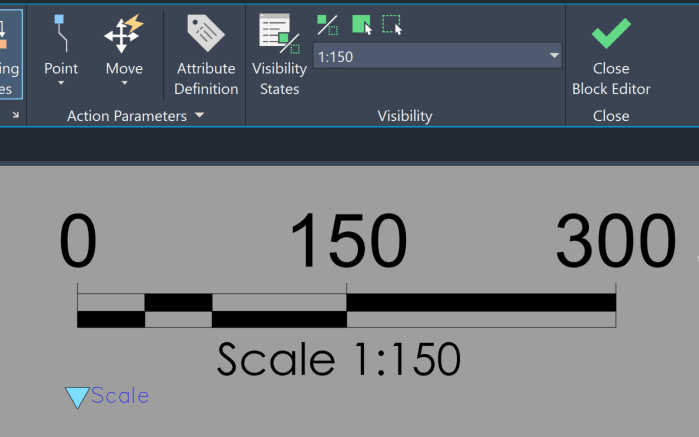 The scale bar from AutoCAD tool palettes is a dynamic block that uses Visibility parameters to define a list of commonly used scales.