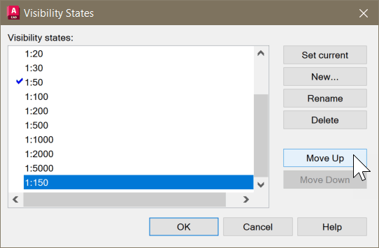 - Note that new Visibility States will be placed at the bottom of the list by default. Open the Visibility States dialog and move the new state up or down as may be necessary.