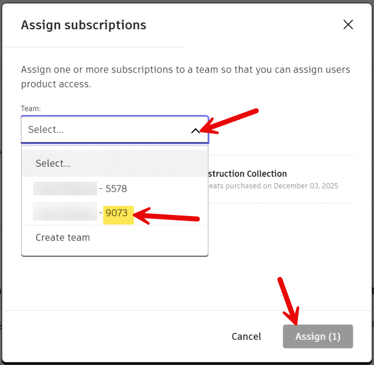 After purchasing an Autodesk subscription, the Autodesk Home page shows “Assign subscription to team”. The license is unable to be assigned to a user. The example image below shows a Team needs to be selected to assign the subscription. In this example, the “User Management” section is missing from the account because there is only one seat and it has not been properly assigned to a team.
