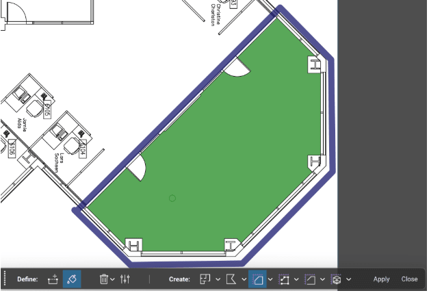 The Dynamic Fill tool automatically creates Spaces and measurement markups from shapes on the content layer. It detects shape boundaries to generate area, perimeter, volume, polylength, or polygon measurements.