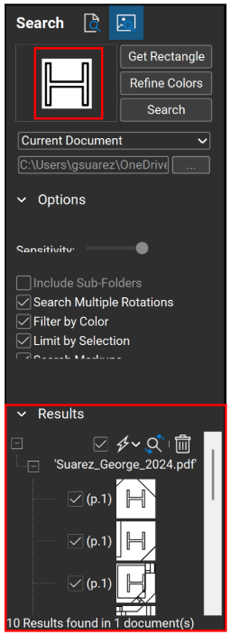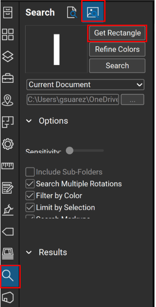To define the search criteria, select Get Rectangle, then draw a bounding box around the symbol or graphic you want to identify throughout the document.