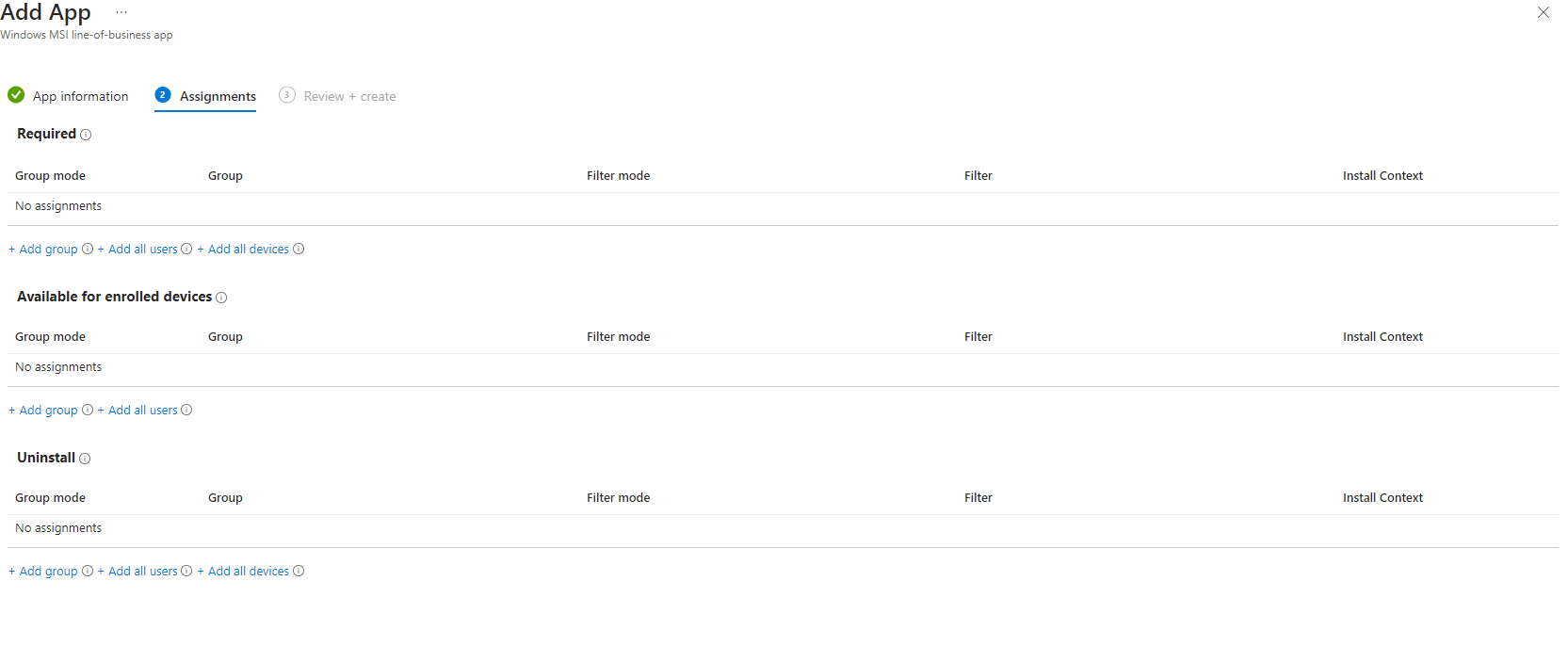 - Under 'Assignments' add the group/devices/users you would like to have the utilities pushed to under 'Required'. If you'd prefer the utilities be uploaded to your company portal, add the group/devices/users under 'Available for enrolled devices'. Click 'Next'.