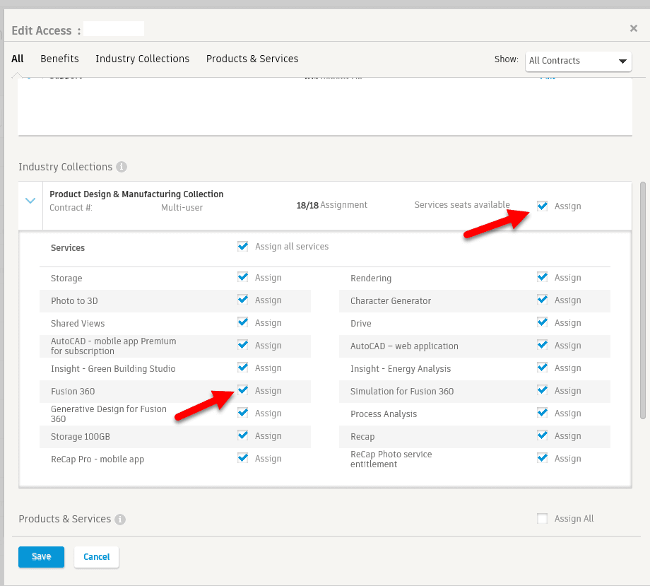 - On the Product Design & Manufacturing Collection put a check mark beside 'Assign'