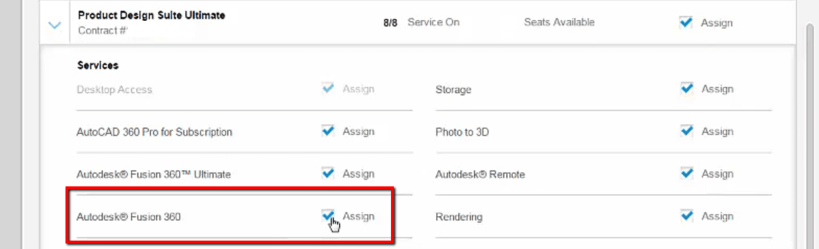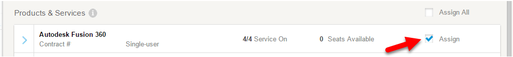 - On the Fusion 360 line item put a check mark beside 'Assign'
