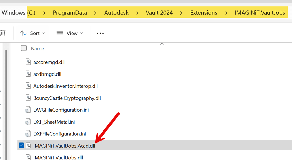 - Navigate to C:\ProgramData\Autodesk\Vault 2024\Extensions\IMAGINiT.VaultJobs, find and select the IMAGINiT.VaultJobs.Acad.dll, and copy the file.