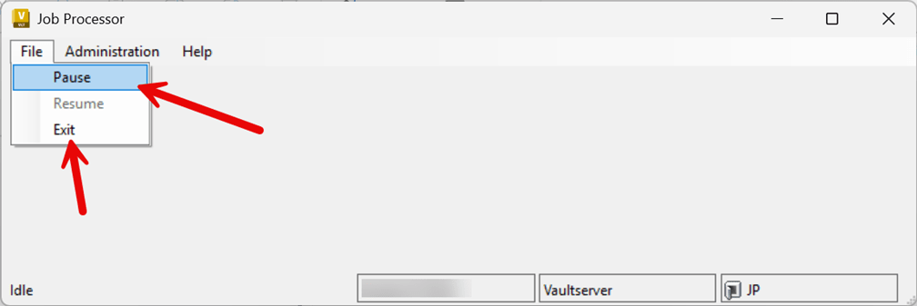 - The Job Processor must be completely stopped and restarted to recognize the recent changes. Open the Job Processor, go to File>Pause, and then File Exit, to ensure the Job Processor is completely stopped.