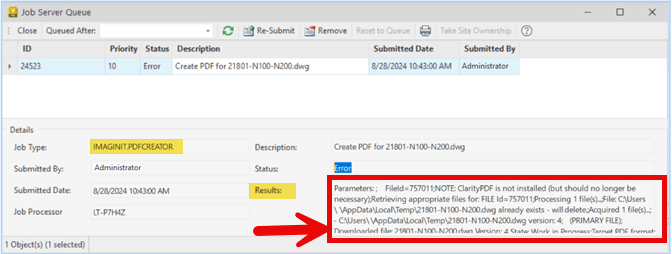 The IMAGINiT Utilities for Vault Client include an IMAGINiT.PDFCREATOR job that is processed by the Vault Job Procesor. Sometimes an error may occur. If the Vault Job Queue displays an error for the Job Type:IMAGINiT.PDFCREATOR, select the job to view the results.