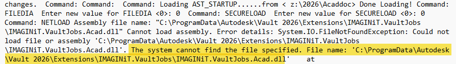 Open the file with Notepad and look for “The system cannot find the file specified. File name: 'C:\ProgramData\Autodesk\Vault 2026\Extensions\IMAGINiT.VaultJobs\IMAGINiT.VaultJobs.Acad.dll'”
