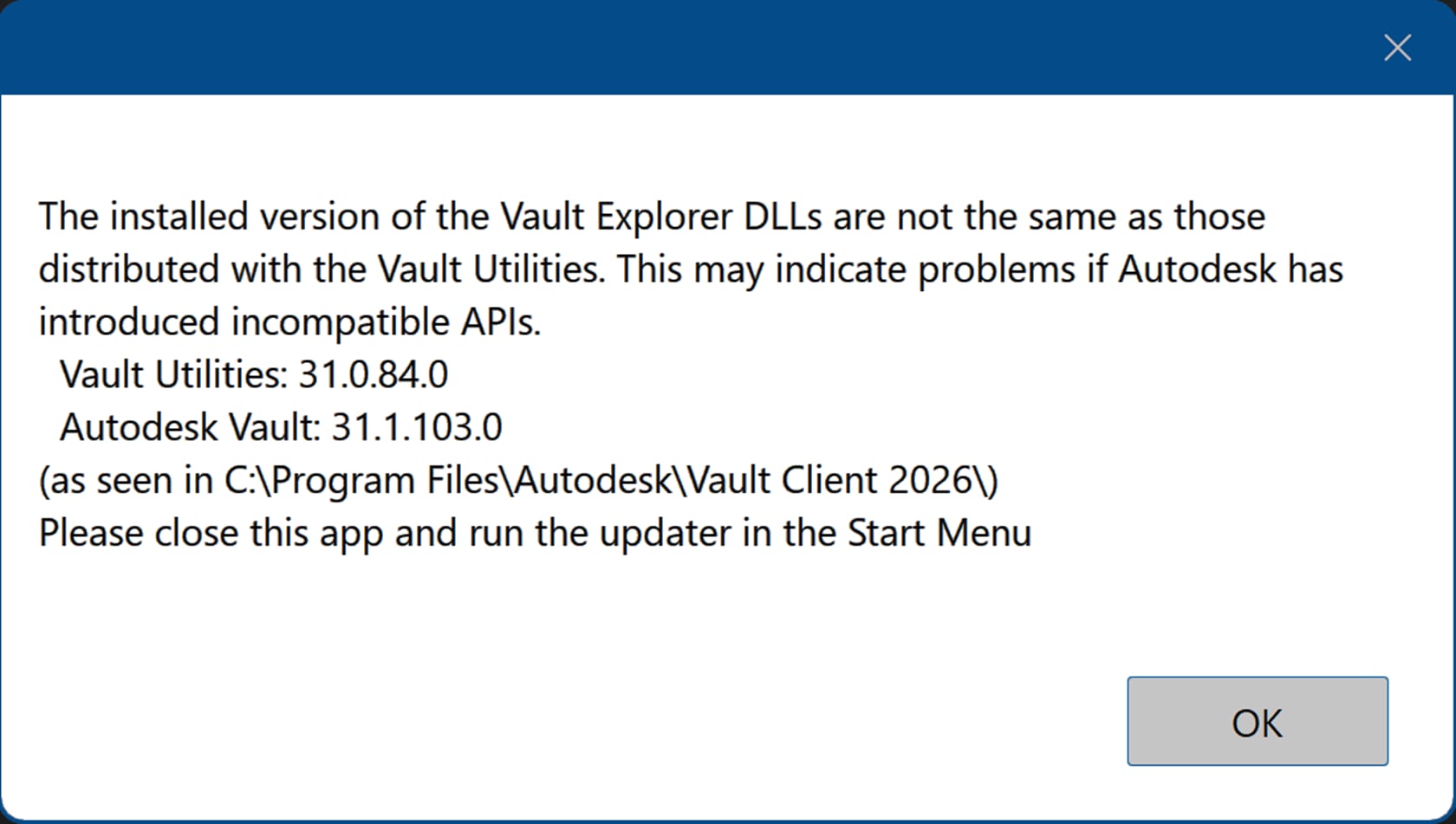 Starting with the 2026 release of the Imaginit Vault Utilities, you will now receive a notice if Autodesk has released updated DLL Libraries which may cause problems with the function of the utilities.