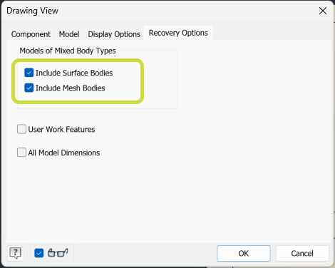 - Select the ‘Include Surface Bodies’ and ‘Include Mesh Bodies’ option on the Recovery Options tab: