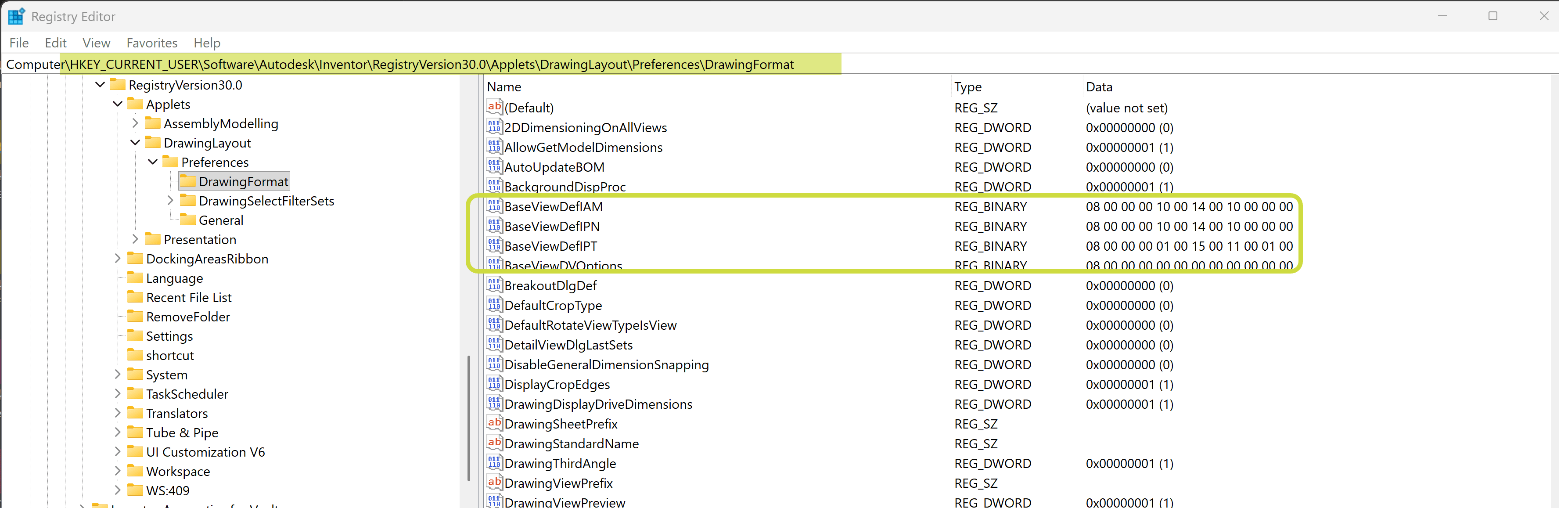 HKEY_CURRENT_USER\SOFTWARE\Autodesk\Inventor\RegistryVersion30.0\Applets\DrawingLayout\Preferences\DrawingFormat