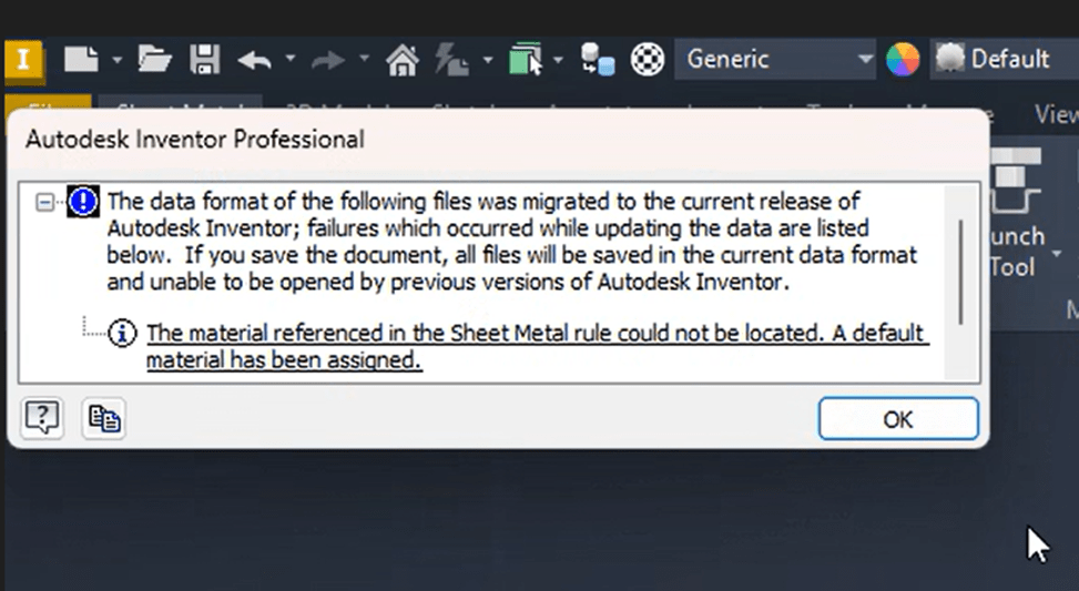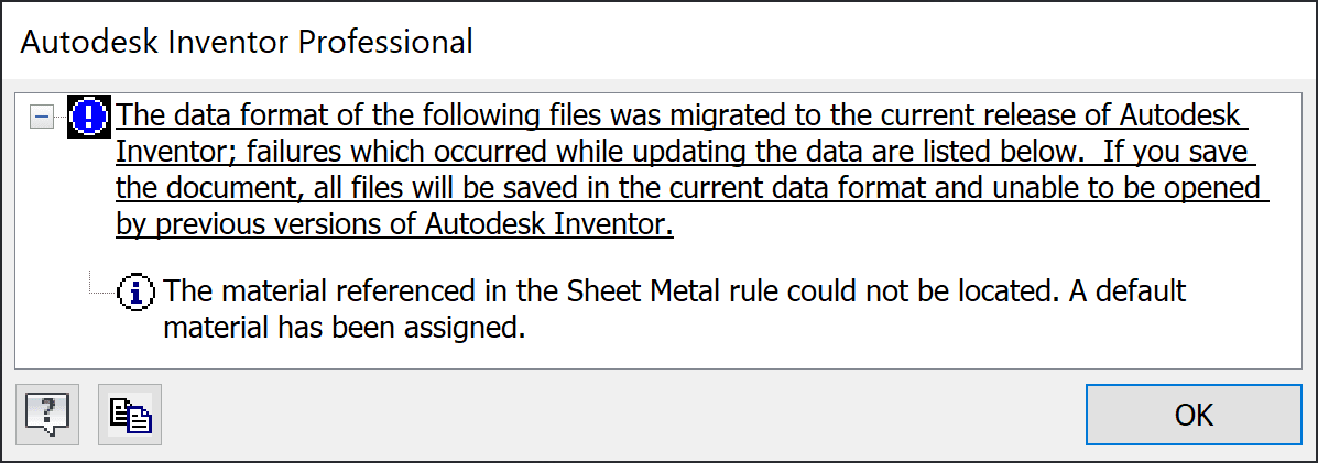 'The data format of the following files was migrated to the current release of Autodesk Inventor' and 'The material referenced in the Sheet Metal rule could not be located. A default material has been assigned'