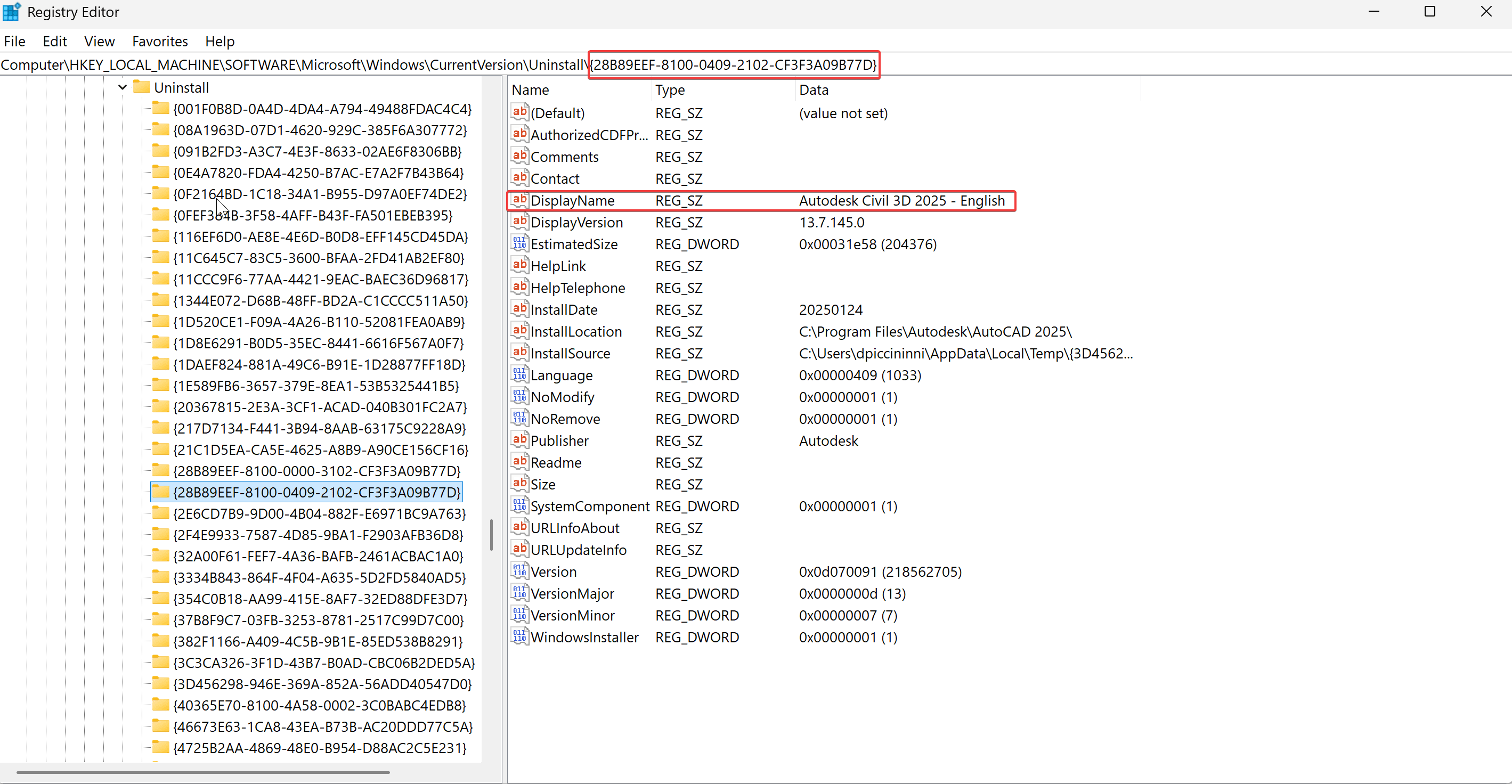 - Find the RegKey with the DisplayName that matches your Autodesk application.