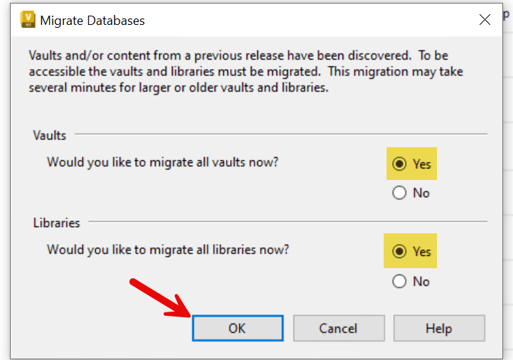 3. A dialog box will appear prompting Yes or No to the migration. Select Yes to migrate Vaults and libraries.