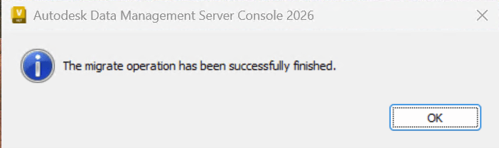 An update for Vault 2026, such as Vault 2026.2, is installed for the Vault ADMS Console 2026. The new Vault build is 2026.2. A database migration needs to occur so both the Vault ADMS Console and Vault databases have matching builds.