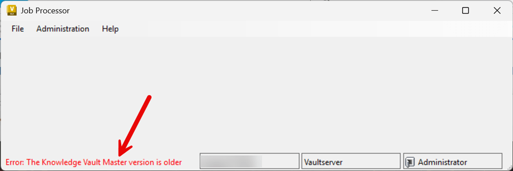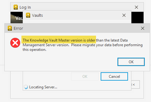 When signing into Vault Client or the Vault Job Processor, a notification appears that states Error: “The Knowledge Vault Master version is older”.
