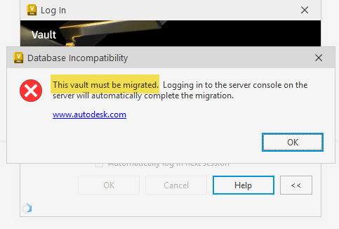 Another potential notification may state Database Incompatibility: “The Vault must be migrated…”.