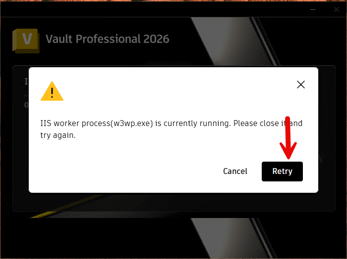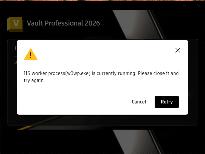 In addition to the IIS Worker Process (w3wp.exe) notification above, there are two additional notifications that may appear when installing the Vault Server 2026.2 update: