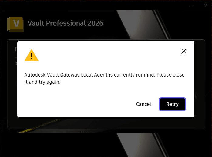 The latest Vault Server 2026.2 update produces a notification, similar to the image below, that a process is currently running and needs to be closed.