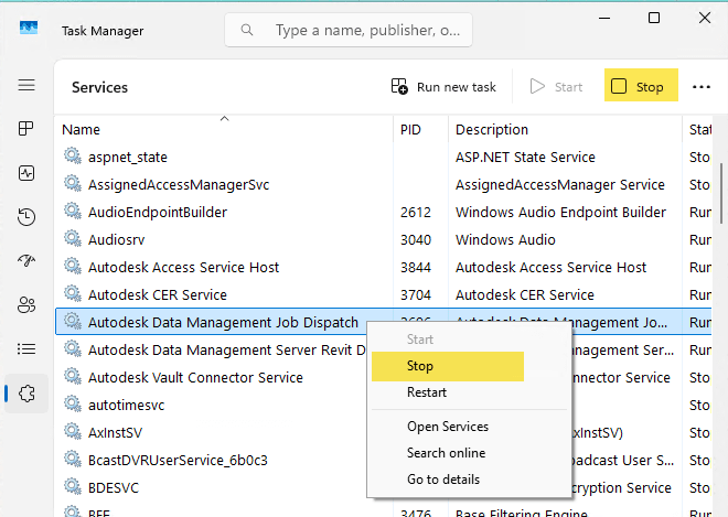 3. Find the Autodesk Data Management Job Dispatch Service. Select Stop.