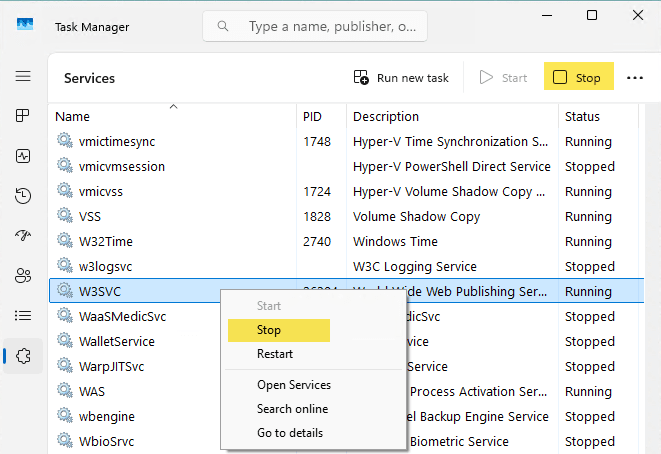 4. Find the World Wide Web Publishing Service (W3SVC). Select Stop.