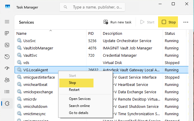 **The Vault Gateway Local Agent may not be found in Task Manager if Vault Gateway has not been configured through the ADMS Console. **